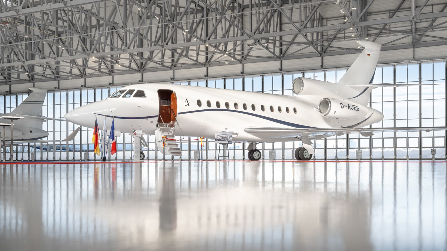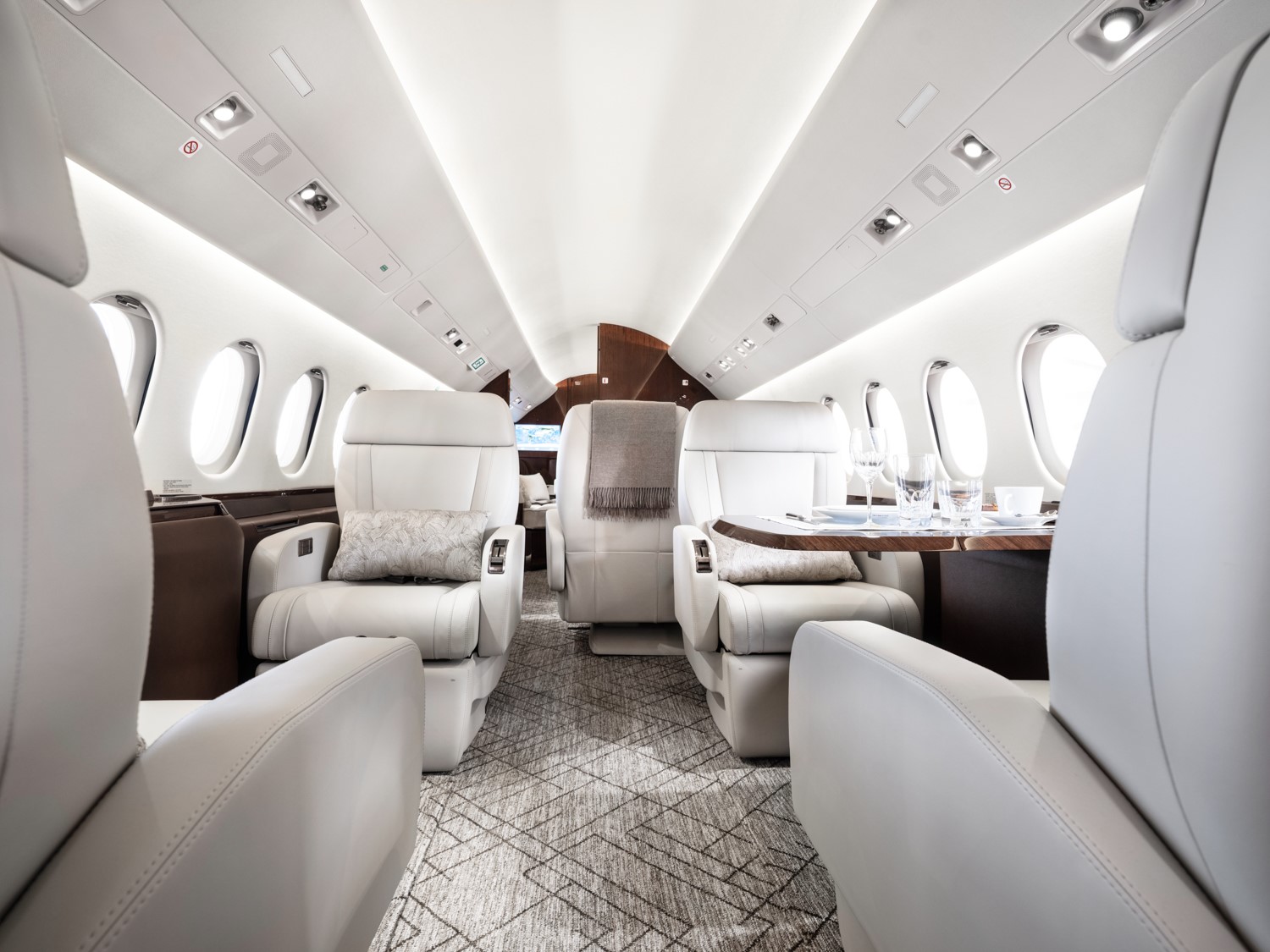 The factory-new Falcon 900LX, registered D-AJES, features an elegant, contemporary cabin designed to deliver exceptional comfort on long-range flights.
