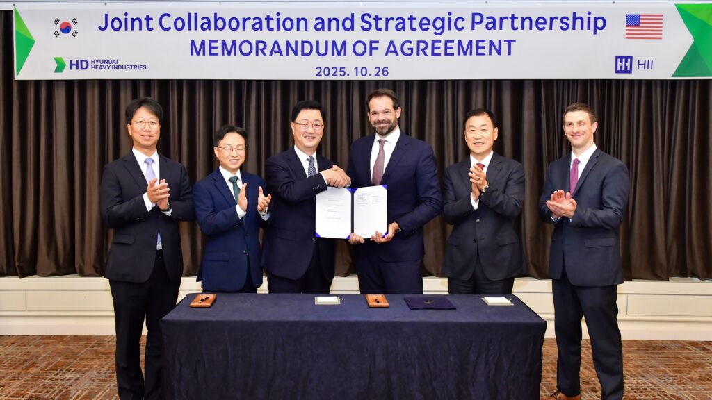 HII and HD Hyundai Heavy Industries (HHI), two of the world’s leading shipbuilders, signed a memorandum of agreement (MOA) at the Asia-Pacific Economic Cooperation (APEC) 2025 forum to advance the objectives of the shipbuilding dialogue between the United States and Republic of Korea. The signing event was attended by Joo Won-ho, president of the Naval & Special Ship Business Unit at HHI, and Eric Chewning, HII’s executive vice president of maritime systems and corporate strategy.